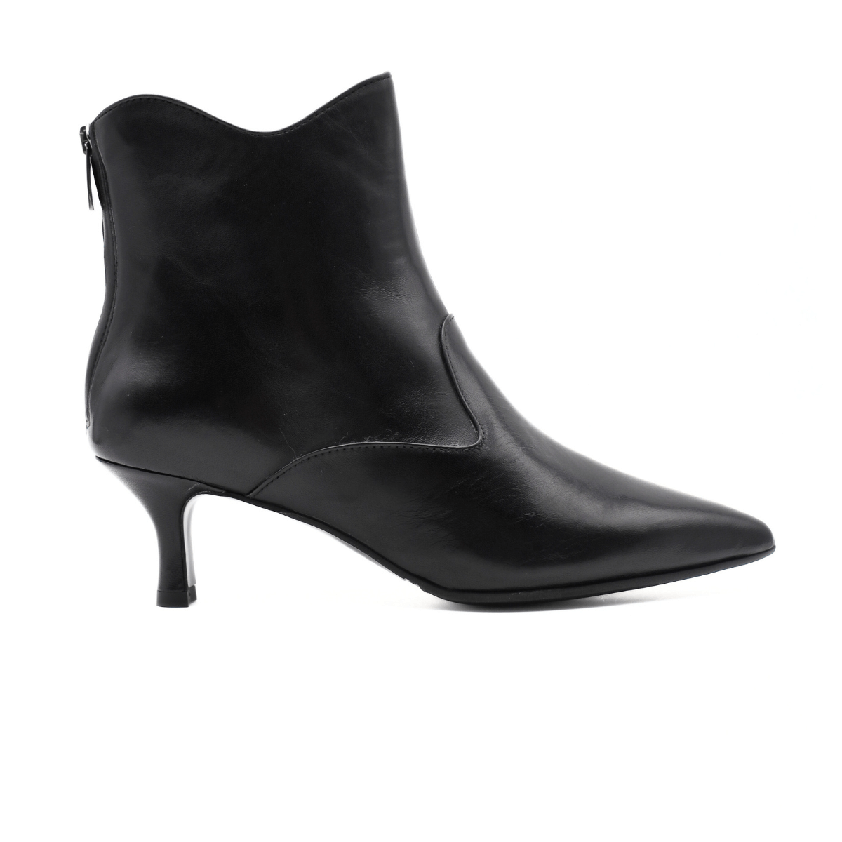 Stivaletto da donna di MALÙ realizzato in pelle nero con zip posteriore e cuciture a vista. Interno e sottopiede foderati in pelle. Suola in gomma.