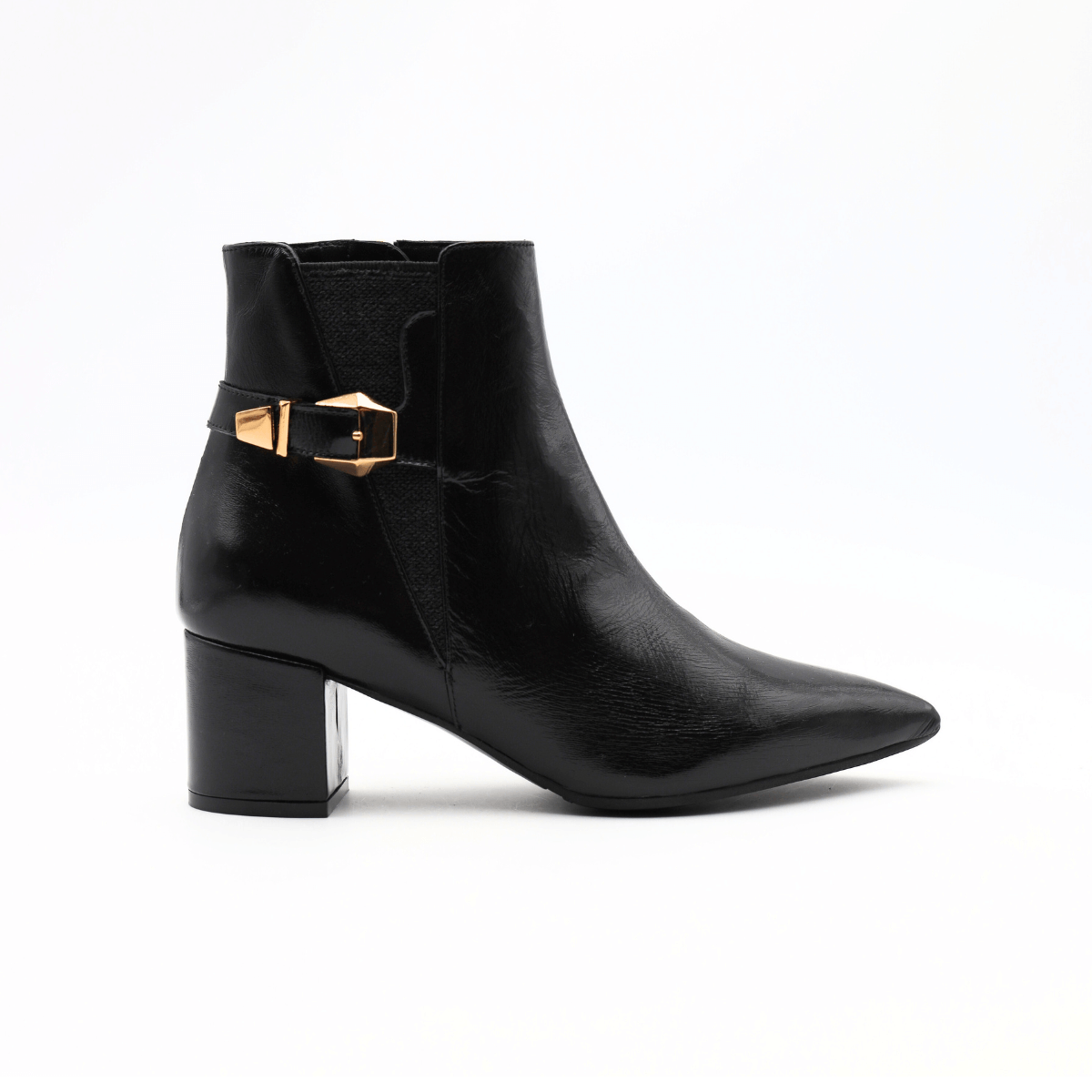 Stivaletto elegante da donna in pelle nappata nera con fibbia ed elastico laterale di MALÙ. Internamente tutto foderato in pelle e nel morbido sottopiede effetto cuscinetto. Tacco largo rivestito in pelle altezza 5 cm, suola antiscivolo in gomma. Chiusura con zip.
