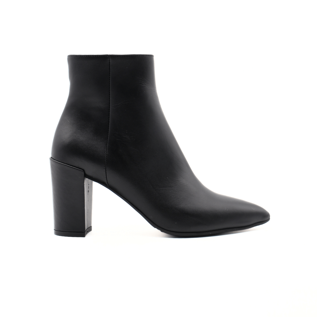 Stivaletto elegante donna in pelle nappata nera di MALÙ. Internamente tutto foderato in pelle e nel morbido sottopiede effetto cuscinetto. Tacco largo rivestito in pelle altezza 8,5 cm, suola antiscivolo in gomma. Chiusura con zip.