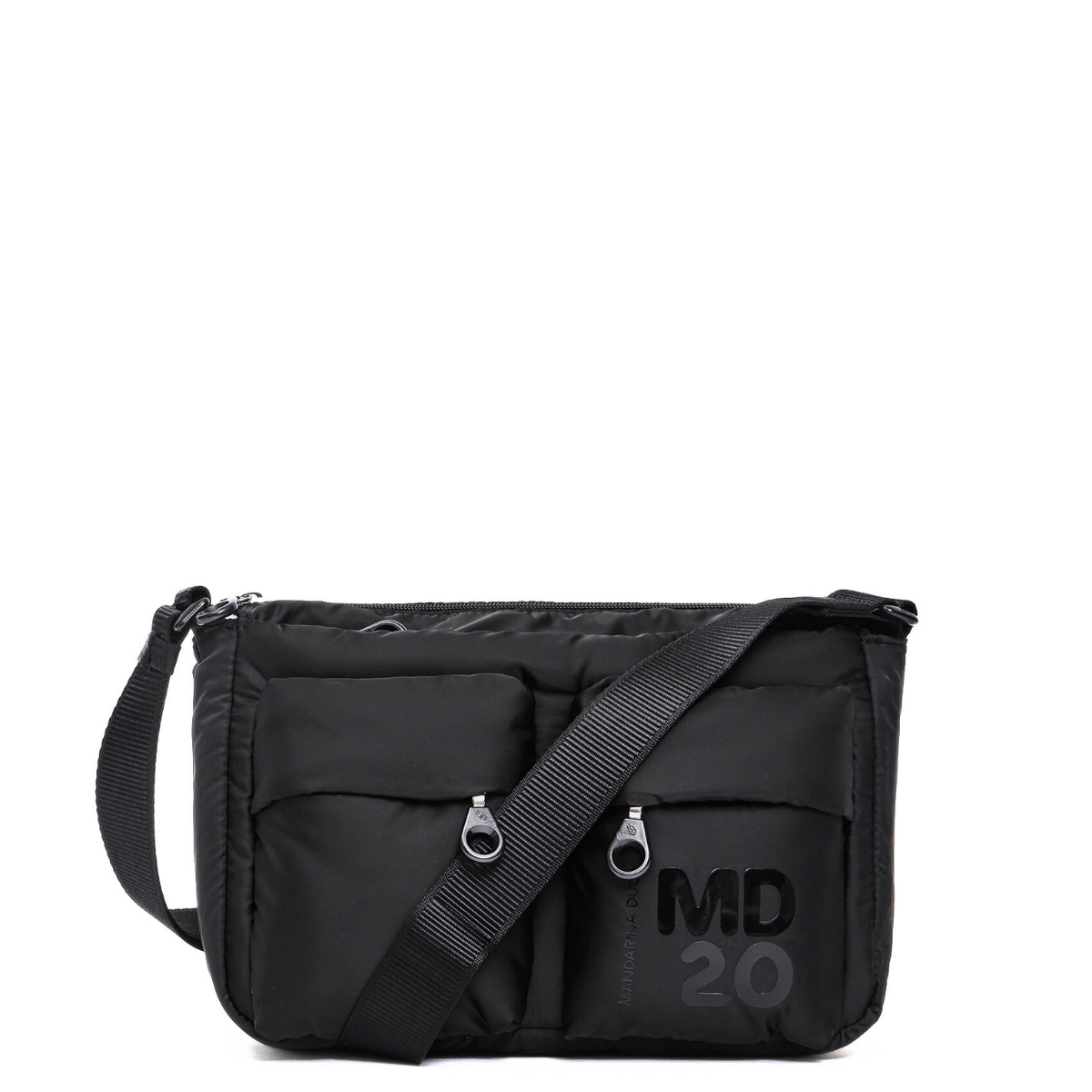 Borsa a tracolla media di MANDARINA DUCK della linea MD20 Balloon. Realizzata in nylon nero imbottito, leggero e morbido con tasche frontali. Interno unico comparto con tasche accessorie. Logo in Lettering stampato tono su tono. Tracolla in nastro jacquard, regolabile con anello scorrevole.