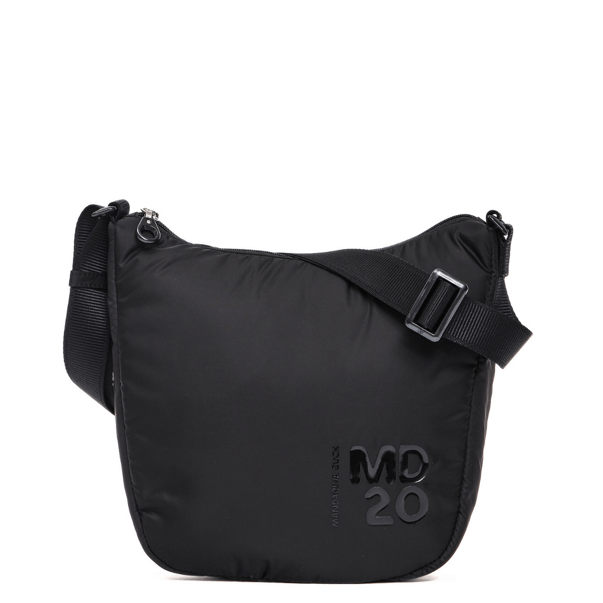 Borsa a tracolla di MANDARINA DUCK della linea MD20 Balloon. Realizzata in nylon nero imbottito, leggero e morbido. Interno unico comparto con tasche accessorie. Logo in Lettering stampato tono su tono. Tracolla in nastro jacquard, regolabile con anello scorrevole.