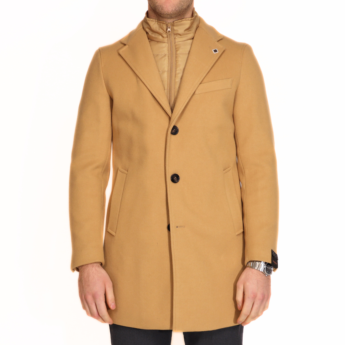 Cappotto da uomo di MARKUP, realizzato in poliestere color cammello, con piumino interno. Lungo con tasche frontali e chiusura con bottoni. Possibilità di rimuovere la parte superiore del piumino con una zip apposita.