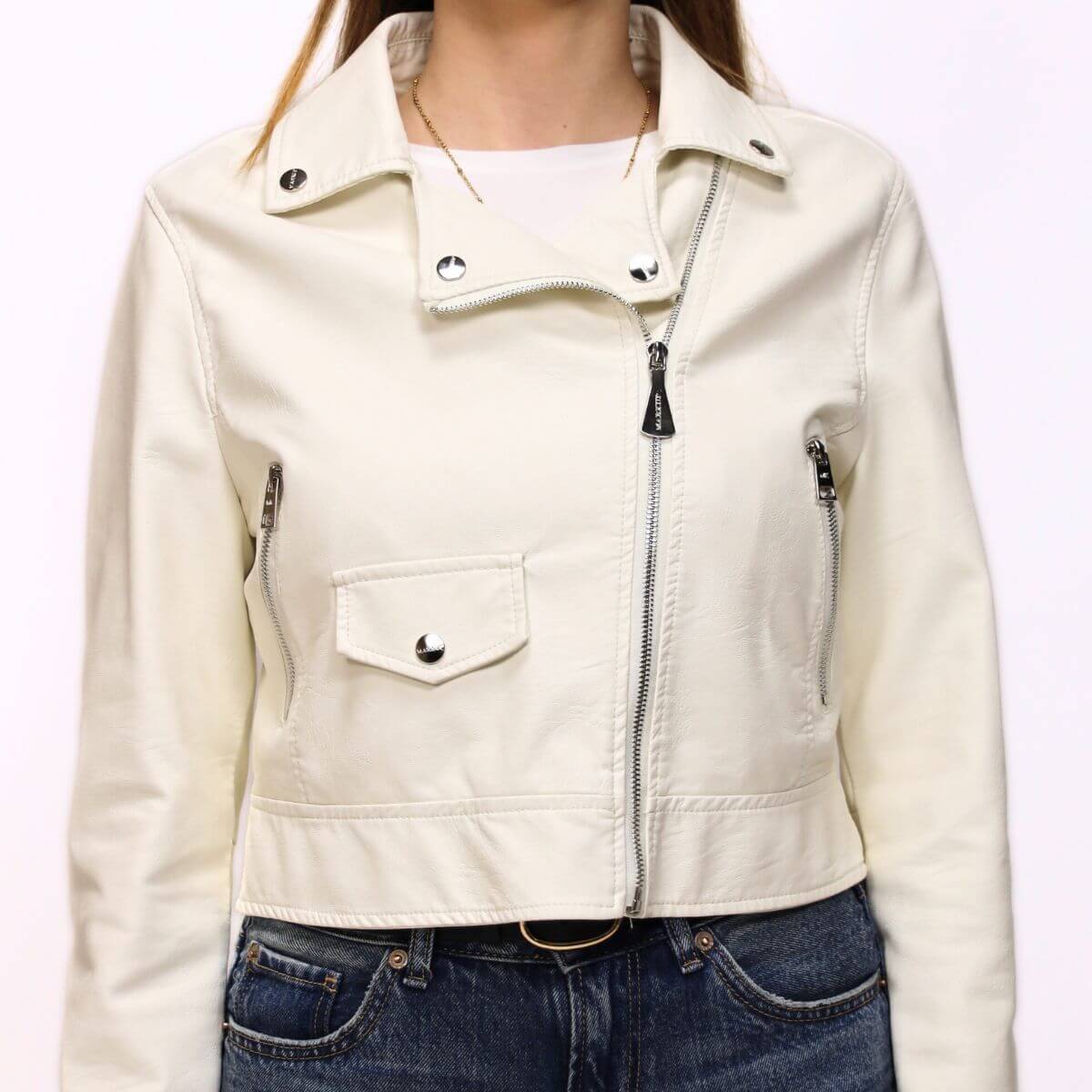 Chiodo corto da donna di MARKUP realizzato in similpelle bianco con chiusura con zip. Manica apribile con zip.