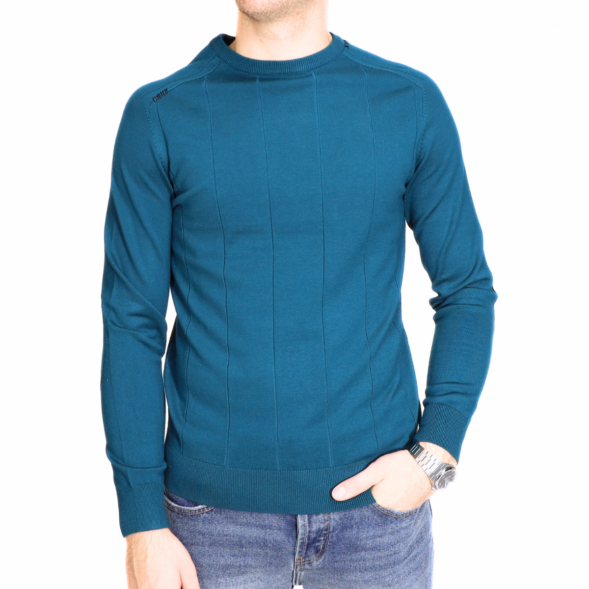 Maglione da uomo di MARKUP in viscosa color cobalto con toppe sul retro della manica. Giro collo. Il modello indossa una L.