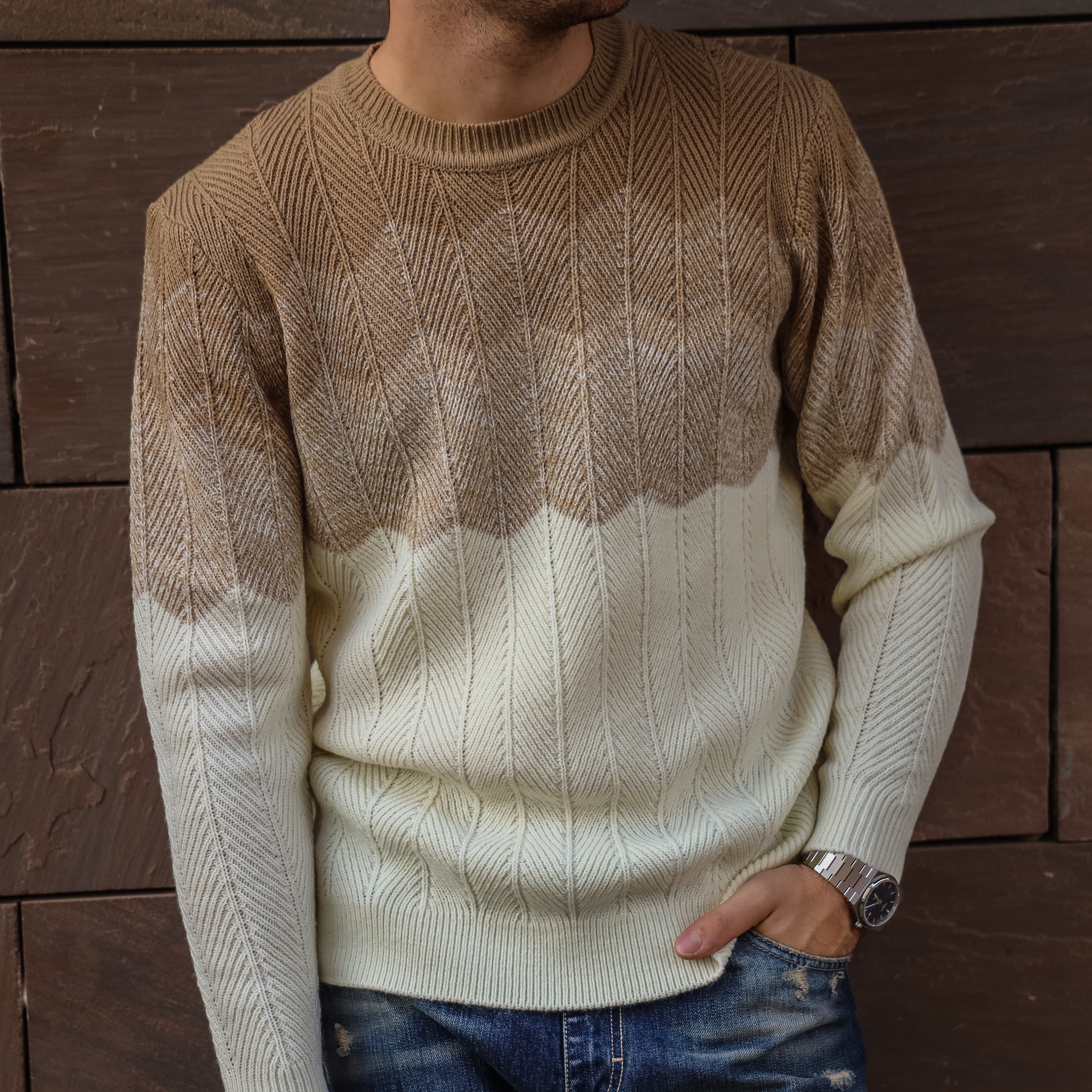 Maglione da uomo di MARKUP in tessuto beige e panna sfumato. Giro collo. Il modello indossa una L.