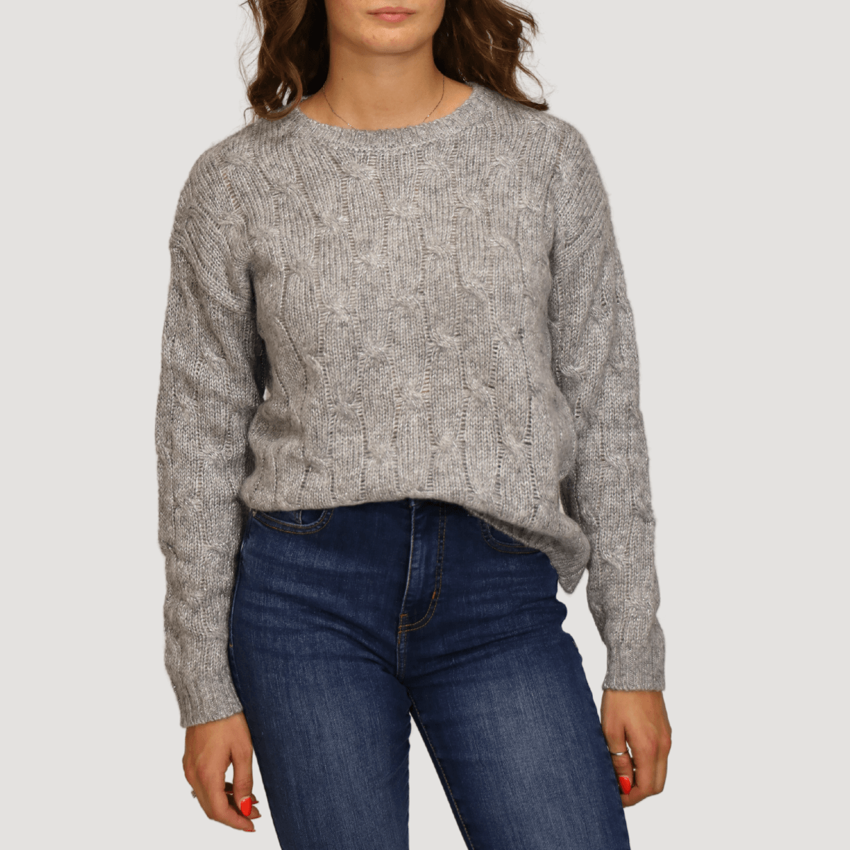 Maglione da donna di MARKUP, realizzato in tessuto caldo con trecce e fili in lurex. La modella indossa una S.