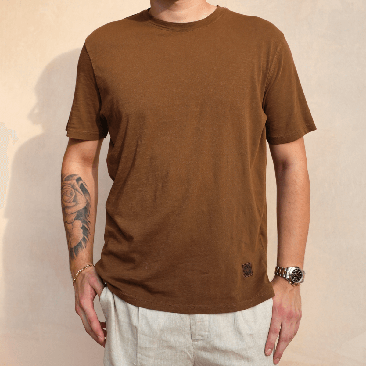 T-shirt da uomo di MARKUP realizzata in 100% cotone. Il colore marrone tabacco aggiunge un tocco di stile naturale e versatile, facile da abbinare a jeans, bermuda o pantaloni chino. Il design classico con girocollo e vestibilità regolare la rende ideale per ogni occasione, dal tempo libero all’uscita serale.
