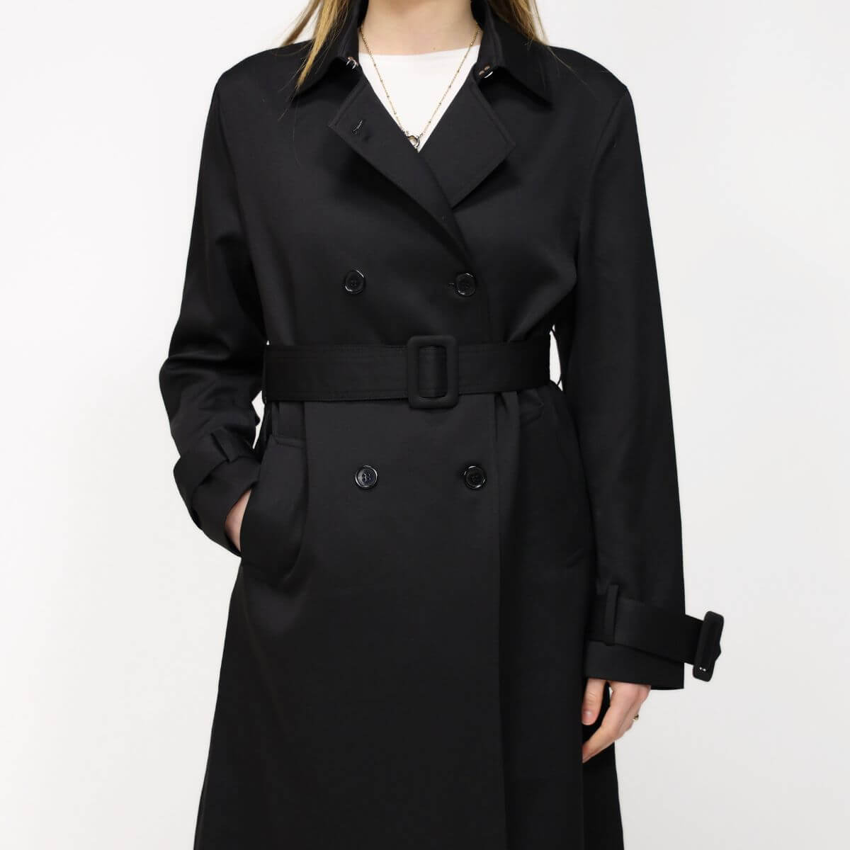 Trench lungo da donna di MARKUP realizzato in tessuto nero con chiusura con bottoni e cintura in vita. Cinturino regolabile anche nelle maniche.