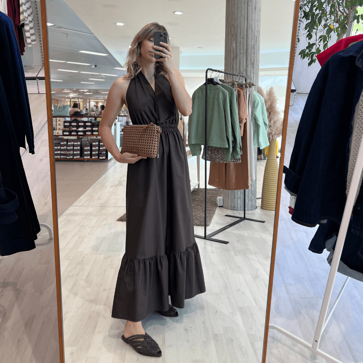 Abito color testa di moro di MARYLEY in 100% cotone. Caratterizzato da un’arricciatura in vita e una chiusura con fiocco al collo, che lascia la schiena scoperta.
