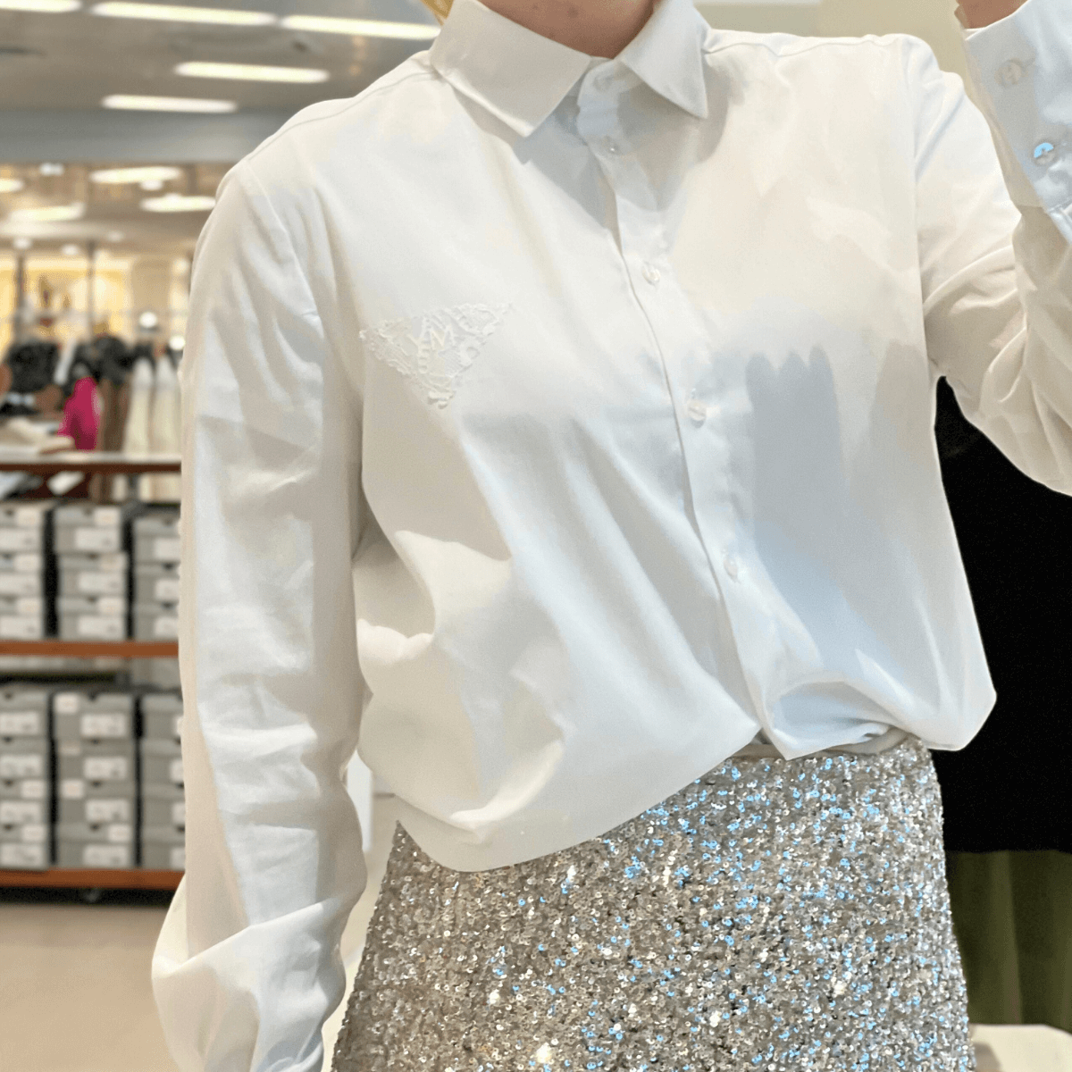 Camicia da donna di MARYLEY bianca con ricamo nel lato sinistro. Chiusura con bottone. Vestibilità regolare.