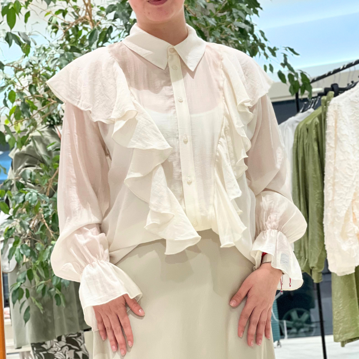 Camicia di MARYLEY realizzata in tessuto leggero e trasparente. Classica chiusura con bottoncini in tono e maniche arricchite da polsini a sbuffo. Rouches sul fronte e sul retro.