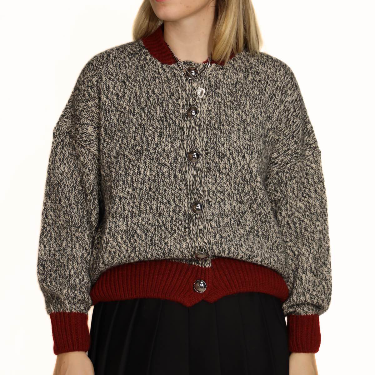 Cardigan da donna di MARYLEY realizzata in tessuto effetto lana grigio e bianco. Chiusura con bottoni argento e scritta ricamata "New York" sulla schiena.