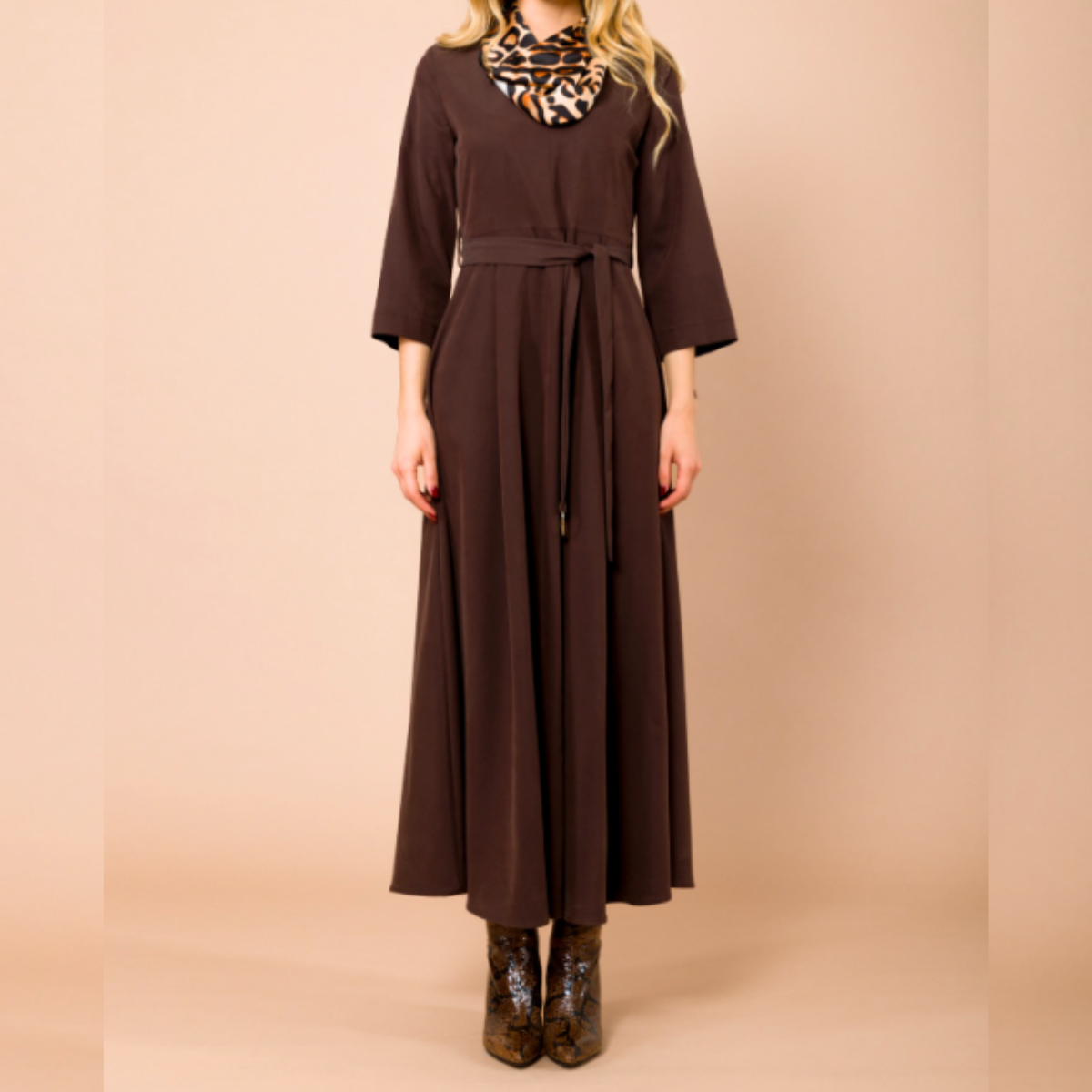 Vestito lungo color marrone di MARYLEY . Caratterizzato una cintura alla vita e da uno scollo a V, con maniche a 3/4. Foulard maculato in dotazione.