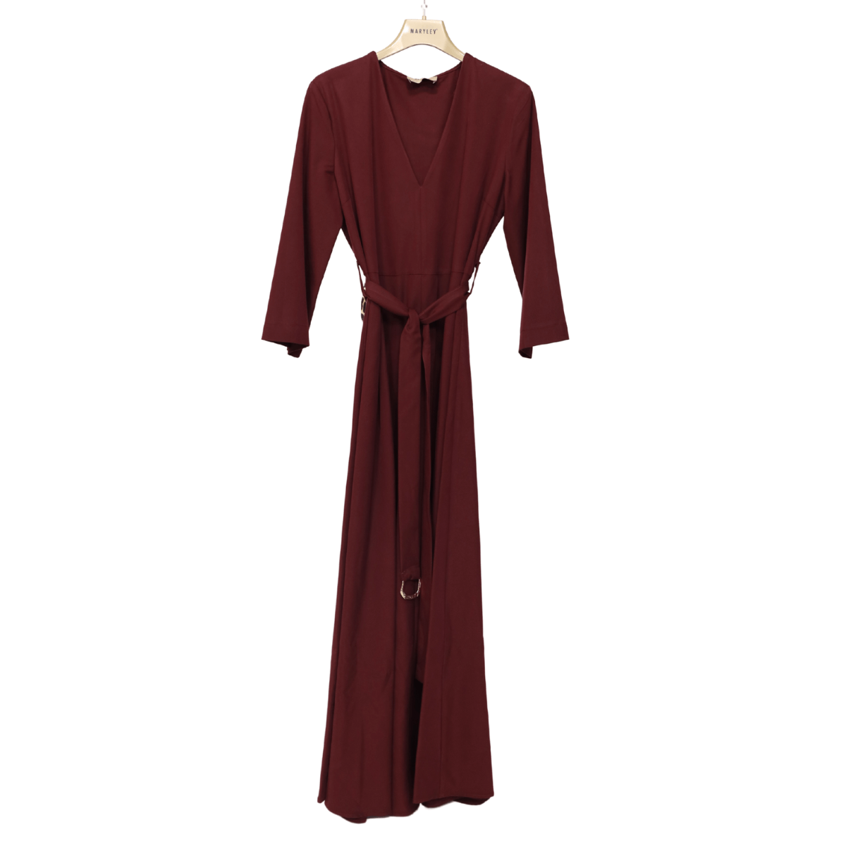 Vestito lungo color bordeaux di MARYLEY . Caratterizzato una cintura alla vita e da uno scollo a V, con maniche a 3/4. Foulard maculato in dotazione.