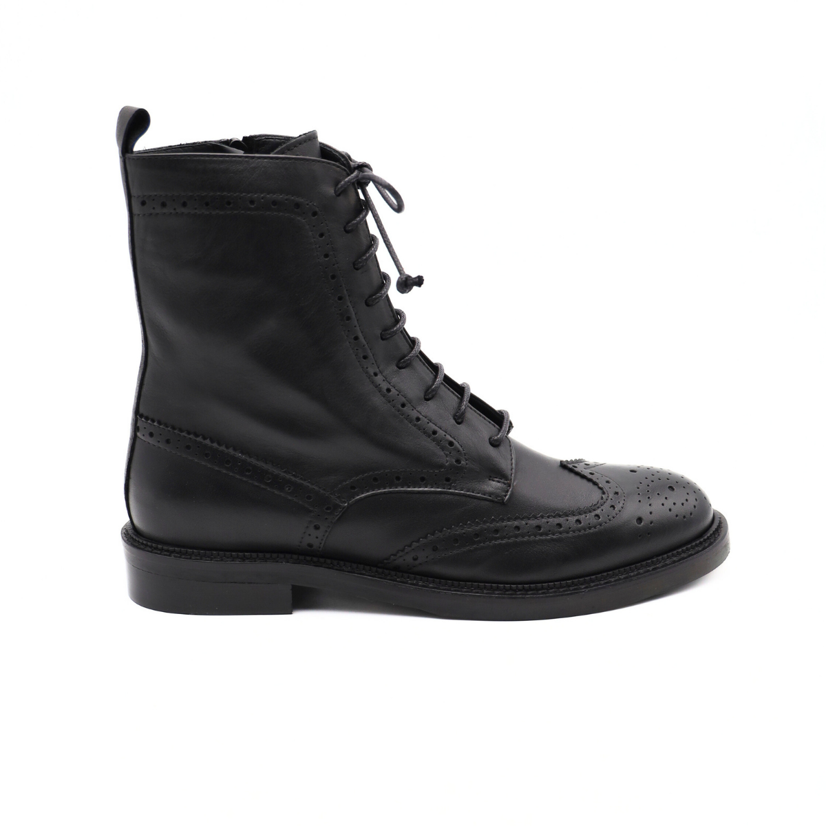 Anfibio da donna con punta all'inglese di MAT20, realizzata in pelle nera. Interno e sottopiede, non estraibile, foderati in pelle. Chiusura con laccio e zip. Suola in gomma.