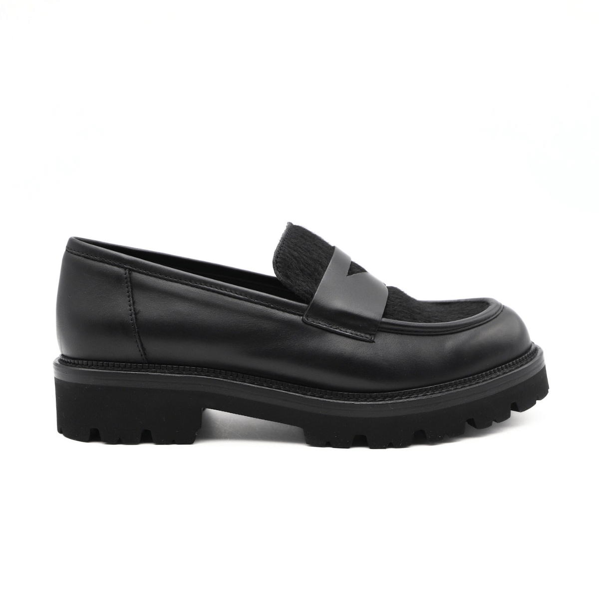 Esaltate il vostro stile con il mocassino, da donna, di MAT20. La tomaia in pelle nera con mascherina ed inserto in cavallino nero. Questo mocassino offre un comfort duraturo grazie alla fodera in pelle e alla suola in gomma.