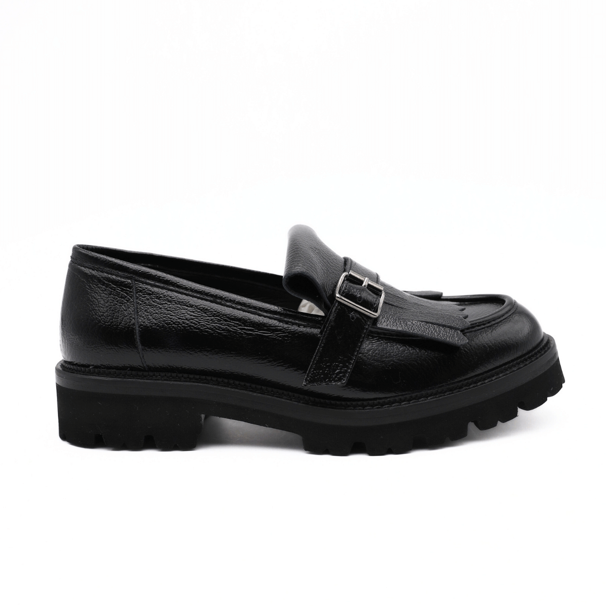 Esaltate il vostro stile con il mocassino, da donna, di MAT20. La tomaia in pelle naplak nero con frange e fibbia regolabile. Questo mocassino offre un comfort duraturo grazie alla fodera in pelle e alla suola in gomma.
