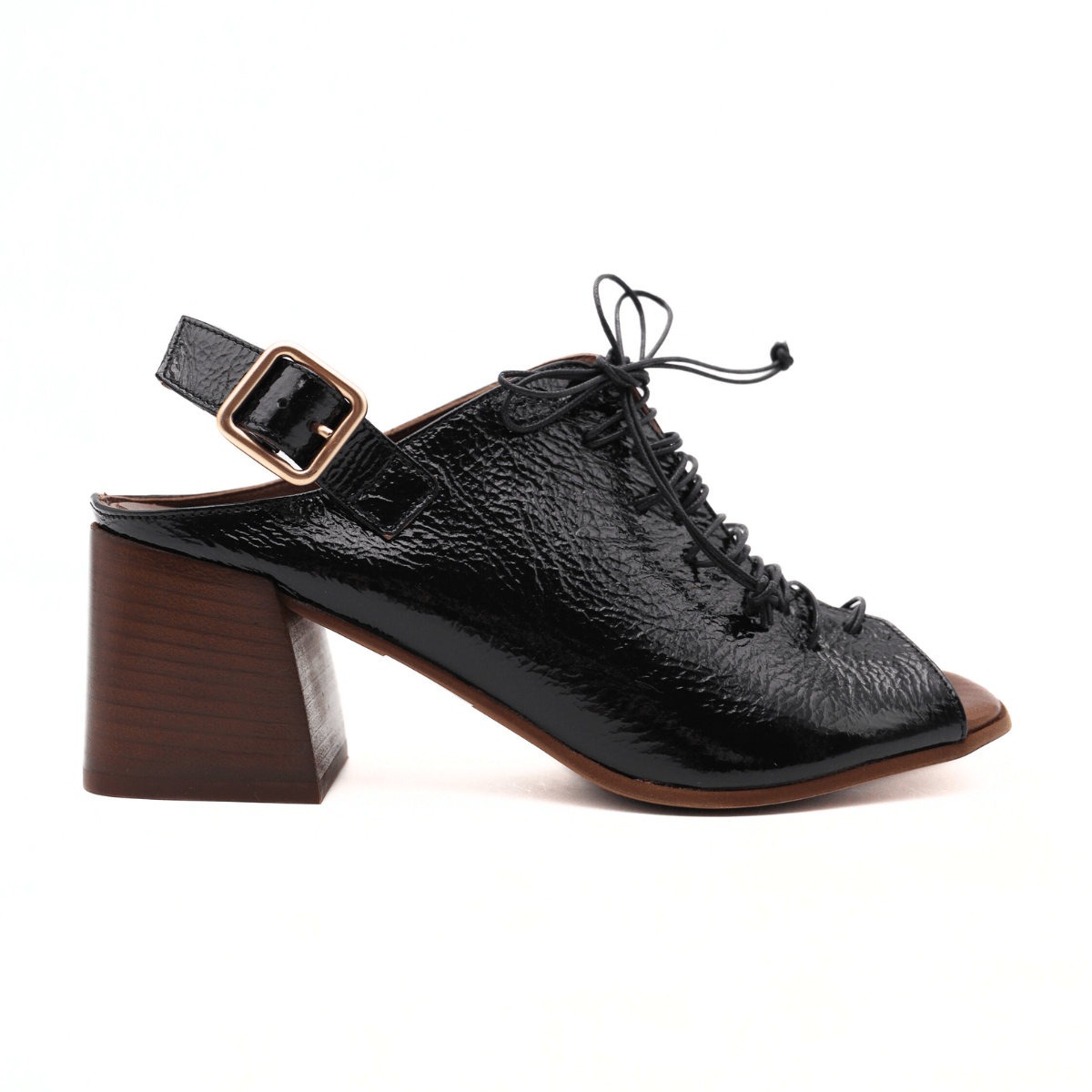 Sandalo da donna di MAT20, realizzato in naplak nero con allacciatura sulla parte frontale. Interno e sottopiede, non estraibile, foderato in pelle. Suola in gomma e tacco in effetto legno 6,5cm.