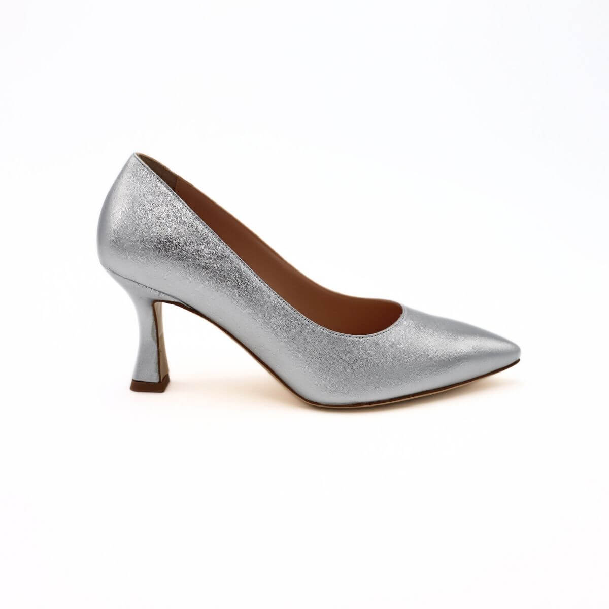 Decollete di MELLUSO. Queste eleganti scarpe realizzate in pelle laminata argento, sono dotate di un comodo interno e soletta in morbida pelle. Un design sofisticato con una suola in cuoio.