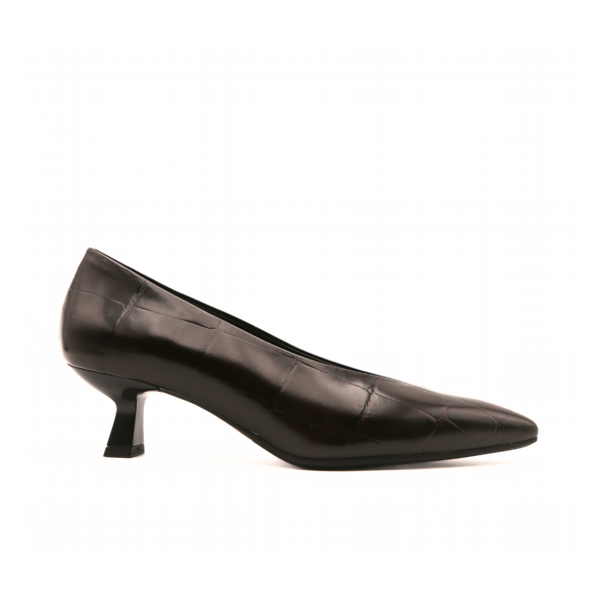 Décolleté di MELLUSO realizzata in pelle testa di moro effetto cocco. Tacco a rocchetto molto comodo di altezza 6 cm. Rivestimento interno e esottopiede in pelle. Suola in gomma.