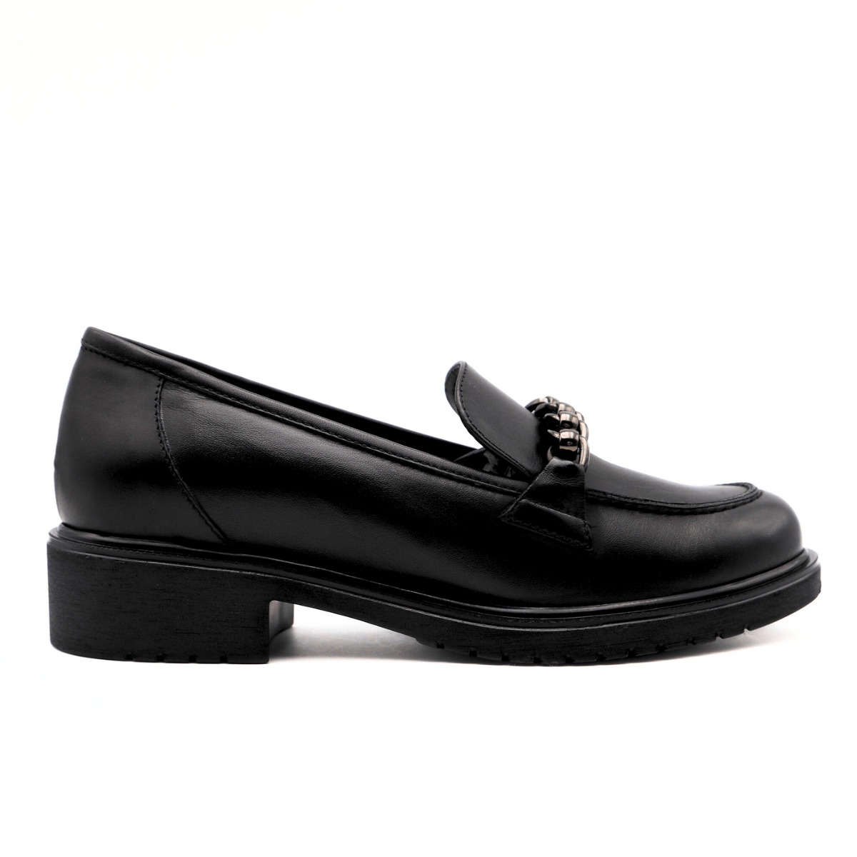 Mocassino da donna di MELLUSO, realizzato in pelle nera con morsetto a catena. Interno e sottopiede, estraibile, foderati in pelle. Suola in gomma con tacco 3.5 cm.