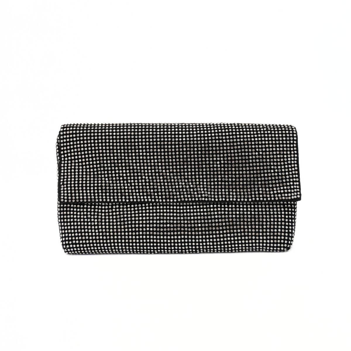 Pochette elegante da donna di MELLUSO realizzata in tessuto nero con strass. Interno unico scomparto. Chiusura con bottone a calamita. Tracollina in catena.