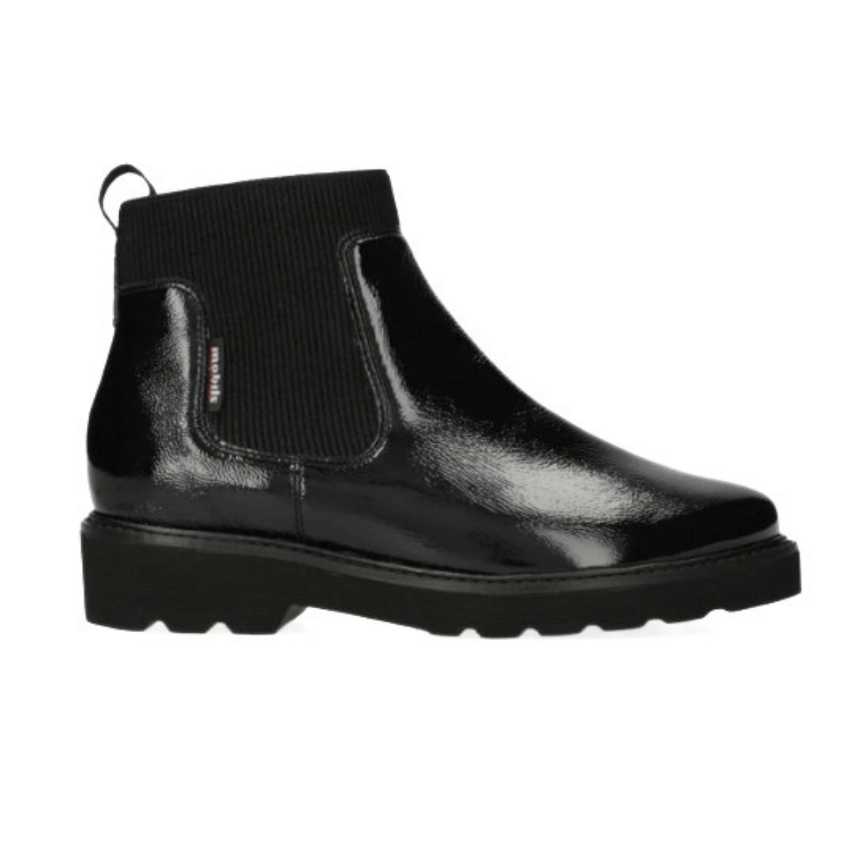 Stivaletto da donna di MEPHISTO. Realizzato in pelle verniciata nera con zip unilaterale e inserto elasticizzato. Internamente foderata in tessuto con sottopiede Mobilis estraibile. Leggera suola in gomma caoutchouc lite, ammortizzata e antiscivolo, con antishoc nel tacco 4 cm.