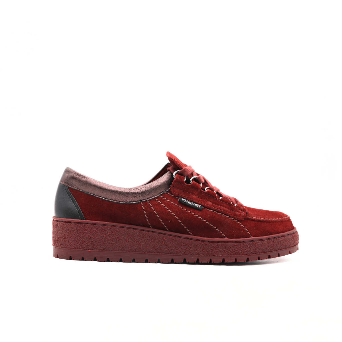 Stringata da donna di MEPHISTO, modello LADY. Realizzato in pelle bordeaux. Internamente foderata in pelle con sottopiede Air relax non estraibile. Leggera suola in gomma (3.5cm).