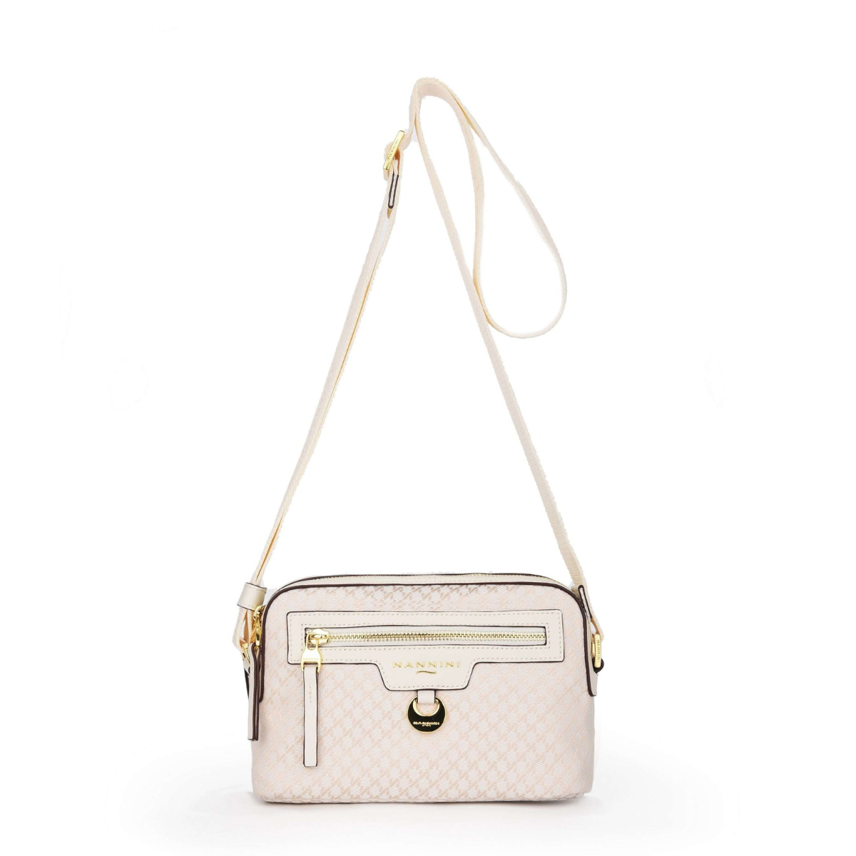 Borsa a spalla da donna di NANNINI, realizzata in tessuto logato nero con tasca frontale. Doppio comparto con tasche accessorie. Tracolla in tessuto regolabile. Chiusura con doppia zip.