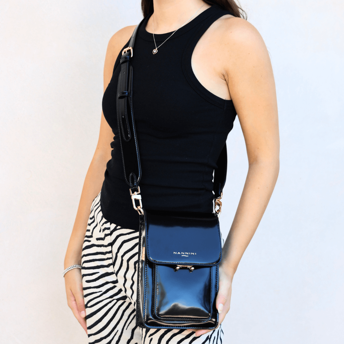 Borsa a tracolla di NANNINI realizzata in pelle spazzolata. Dotata di tracollina regolabile, removibile e chiusura a farfalla. Dettagli in oro e due taschine: una anteriore e una posteriore.