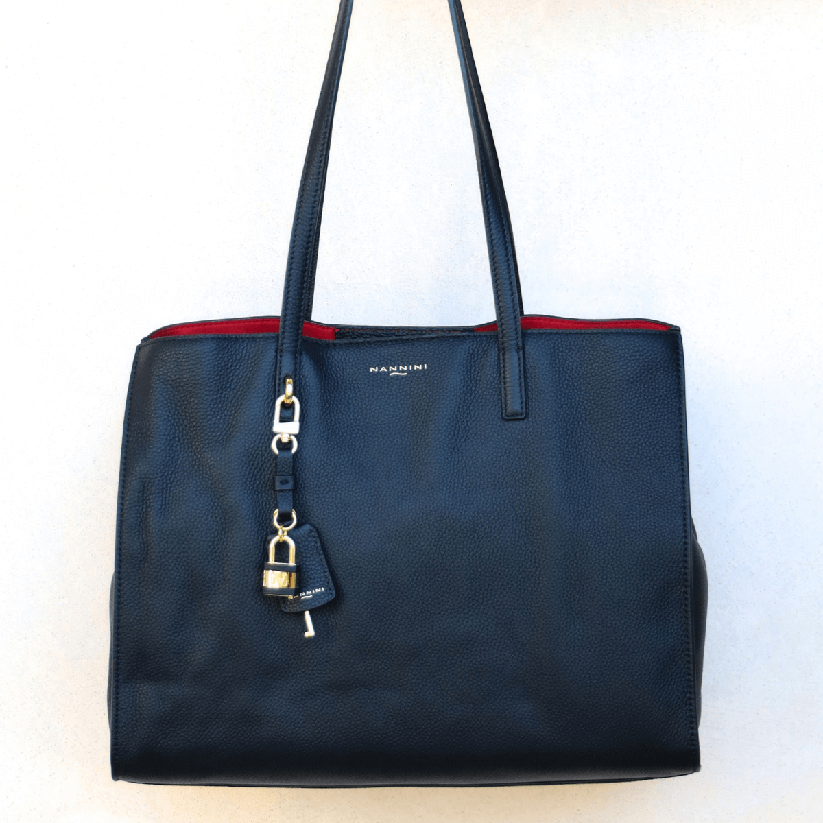 Borsa a spalla di NANNINI realizzata in morbida pelle martellata. Interno foderato in tessuto a contrasto rosso e diviso in tre scomparti, è dotata di una bustina removibile in pelle. Presenta una pratica tasca sul lato posteriore e una chiusura con cerniera. Arricchita da dettagli oro.