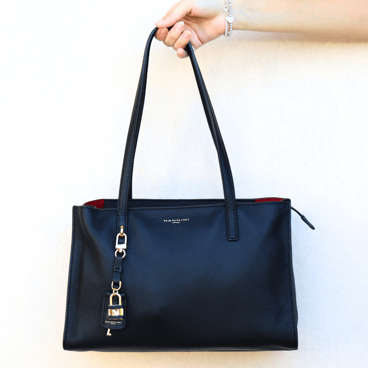Borsa a spalla di NANNINI realizzata in morbida pelle martellata. Interno foderato in tessuto a contrasto rosso, è dotata di una bustina removibile in pelle. Presenta una pratica tasca sul lato posteriore e una chiusura con cerniera. Arricchita da dettagli oro.