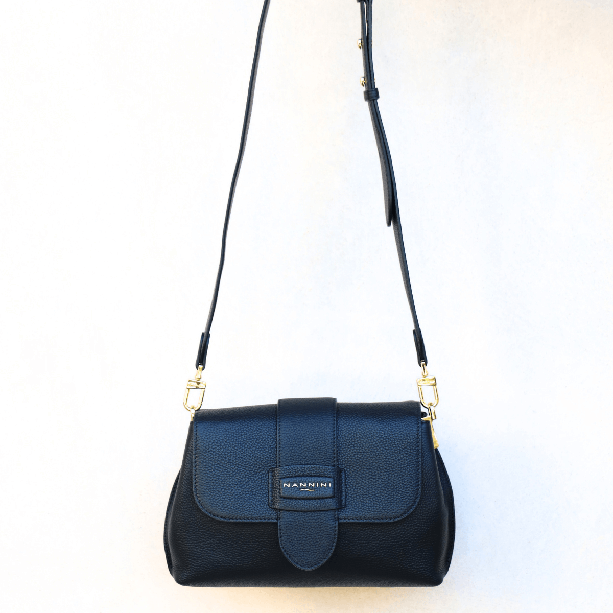 Borsa a tracolla di NANNINI realizzata in morbida pelle martellata, interno foderato in tessuto e diviso in tre scomparti, di cui uno con cerniera. Chiusura con patta e bottoncino magnetico. Dotata di tracolla removibile e regolabile, presenta una tasca posteriore.