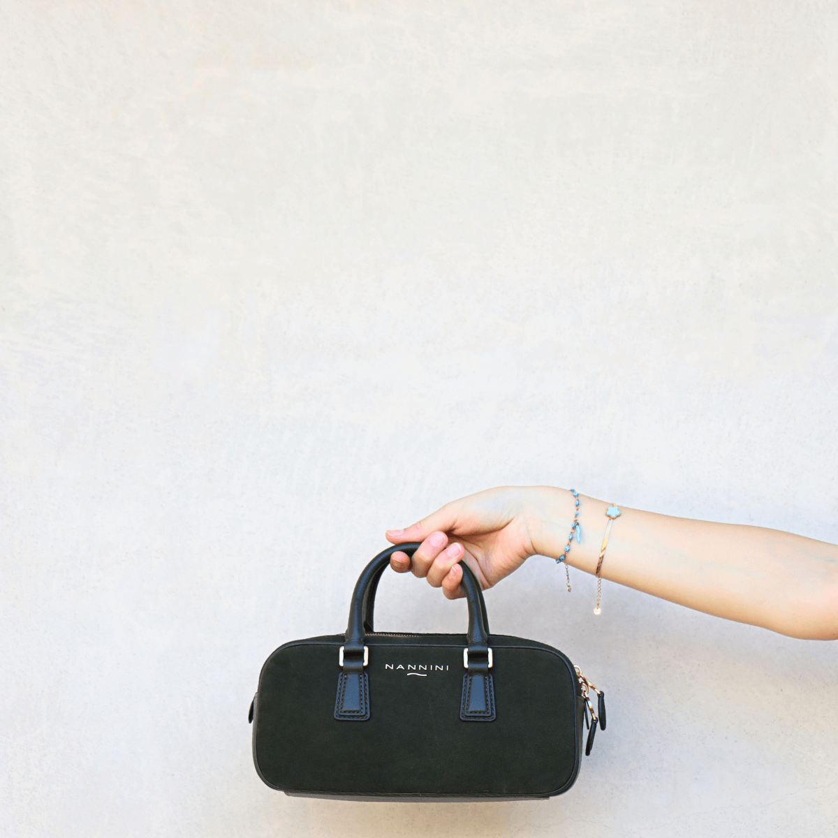 Borsa a mano di NANNINI realizzata in pelle scamosciata con inserti in pelle martellata in tono. Dotata di un'unica tasca, presenta una tracolla removibile e regolabile. Chiusura con cerniera e inserti dorati.