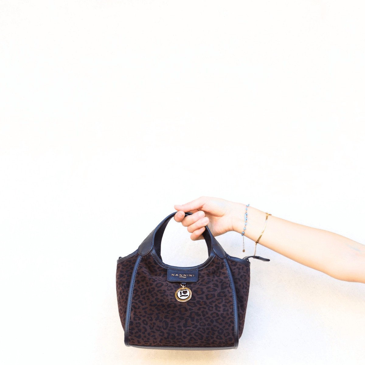 Borsa di NANNINI modello SIRIA, realizzata in pelle scamosciata marrone con stampa maculata.