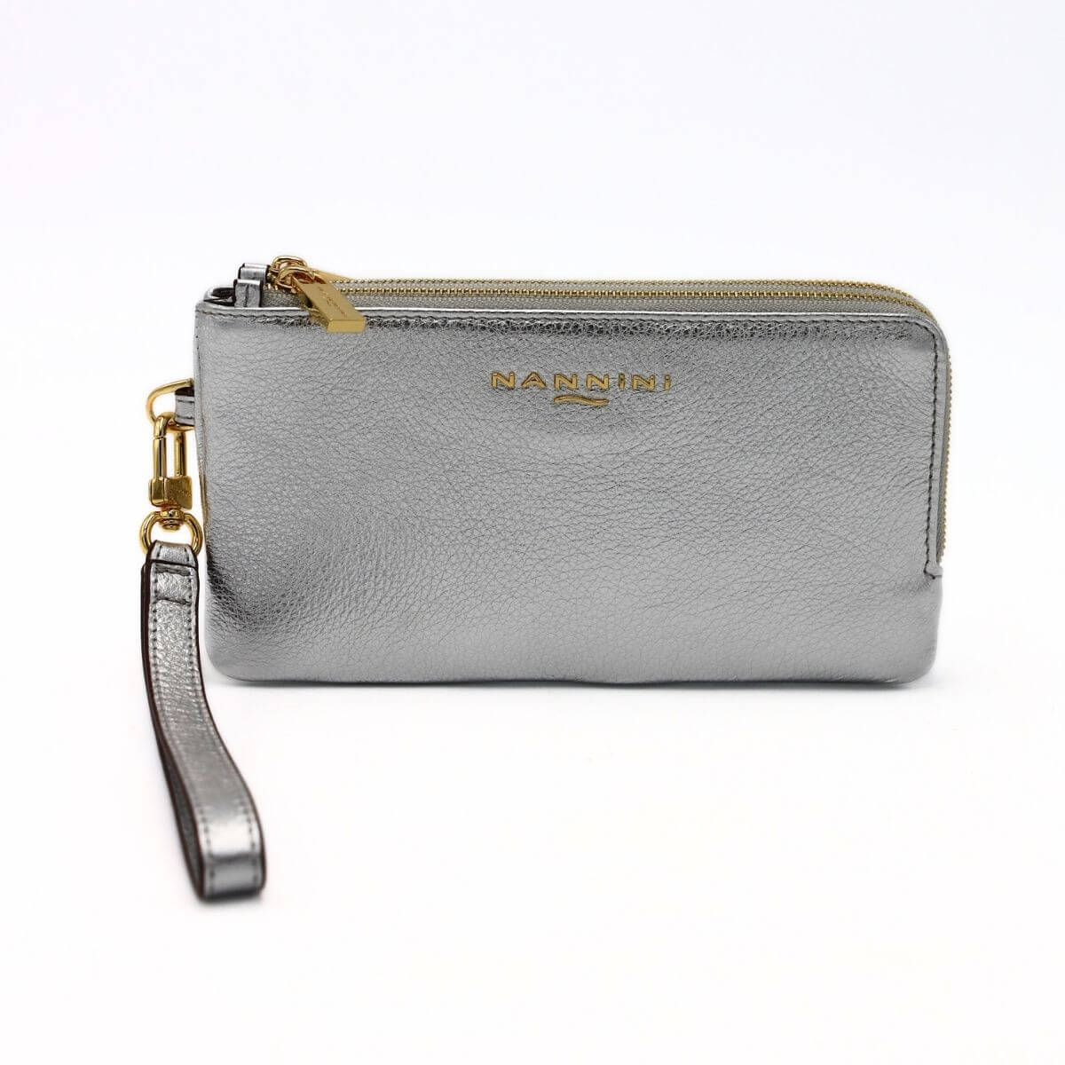Portafoglio da donna di NANNINI FIRENZE, realizzato in morbida pelle bottalata argento laminato. Dotato di due cerniere, presenta due ampie tasche, ciascuna dotata di inserti portacarte. Taschina con cerniera sul retro. Dotato di passante in tono removibile.