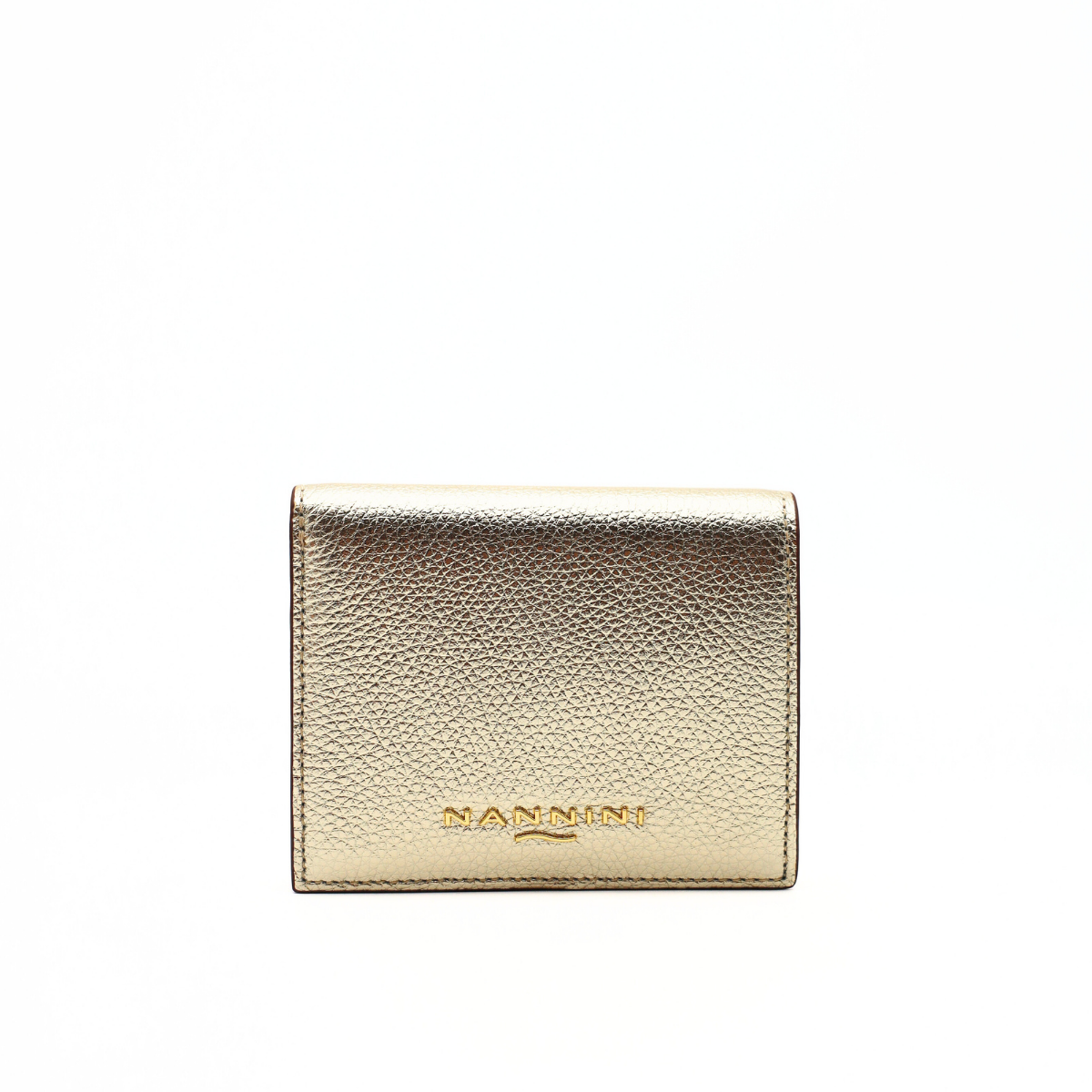 Portafoglio da donna di NANNINI FIRENZE, realizzato in morbida pelle bottalata oro laminata. Presenta una apertura a libro per il portatessere e portamonete e una tasca per le banconote. Chiusura con bottoncino a pressione.