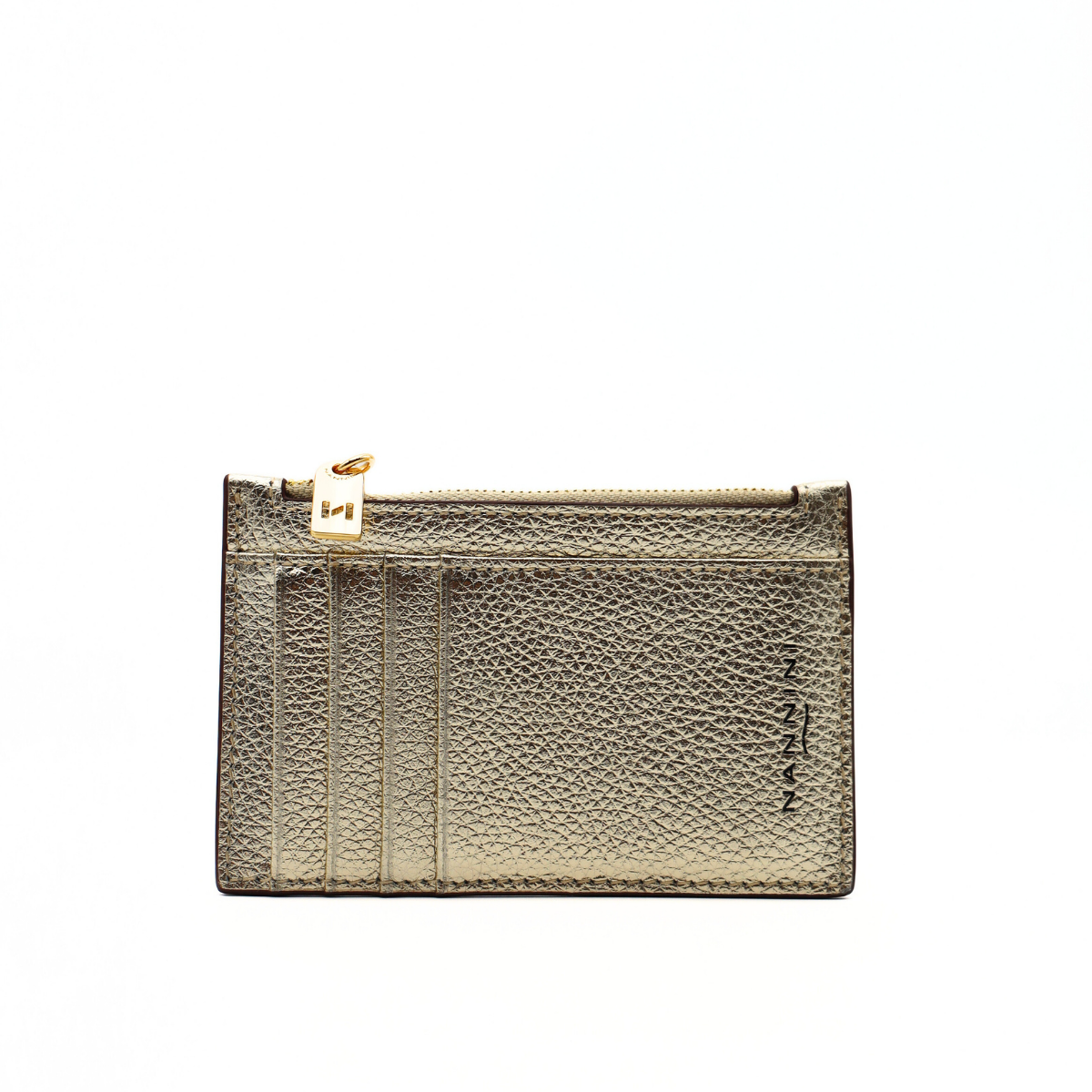 Presenta una tasca con zip e uno slot porta carte, anche i dettagli sono color oro.