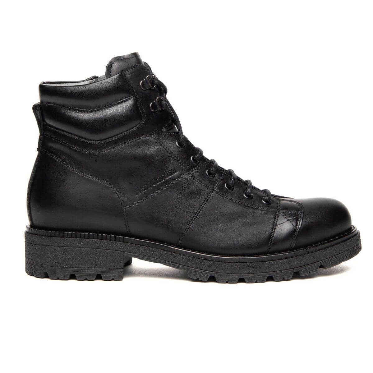 Anfibio di Nero Giardini, personalità e stile unico. Realizzato in pelle color nero con gancetti e chiusura con zip unilaterale. Interno e sottopiede, estraibile, in pelle. Suola in gomma carrarmato.
