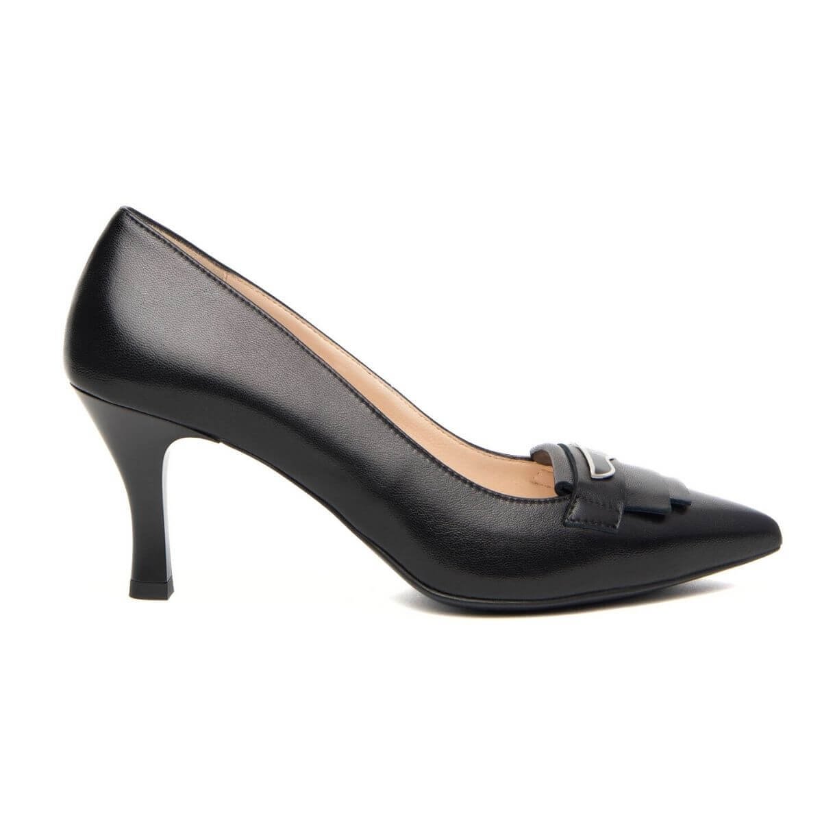 Décolleté donna di NERO GIARDINI. Tomaia realizzata in pelle nero con logo in argento sul puntale. Interno e sottopiede foderati in pelle. Suola in gomma con inserto antiscivolo.