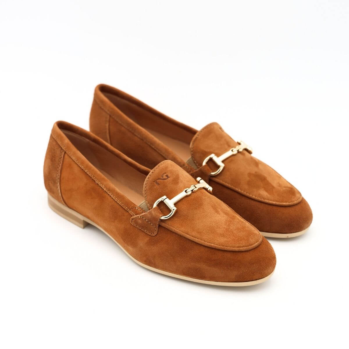 Mocassino donna di Nero Giardini. Tomaia realizzata in pelle scamosciata color cuoio con morsetto oro. Interno foderato in pelle, sottopiede non estraibile. Suola in gomma, con tacco 1cm.