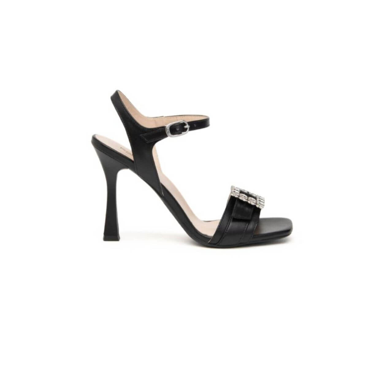 Sandalo elegante da donna di NERO GIARDINI, realizzato in pelle con con fascia nera con fibbia con strass. Cinturino di chiusura con vita. Interno e sottopiede in pelle. Tacco a rochetto 10cm.