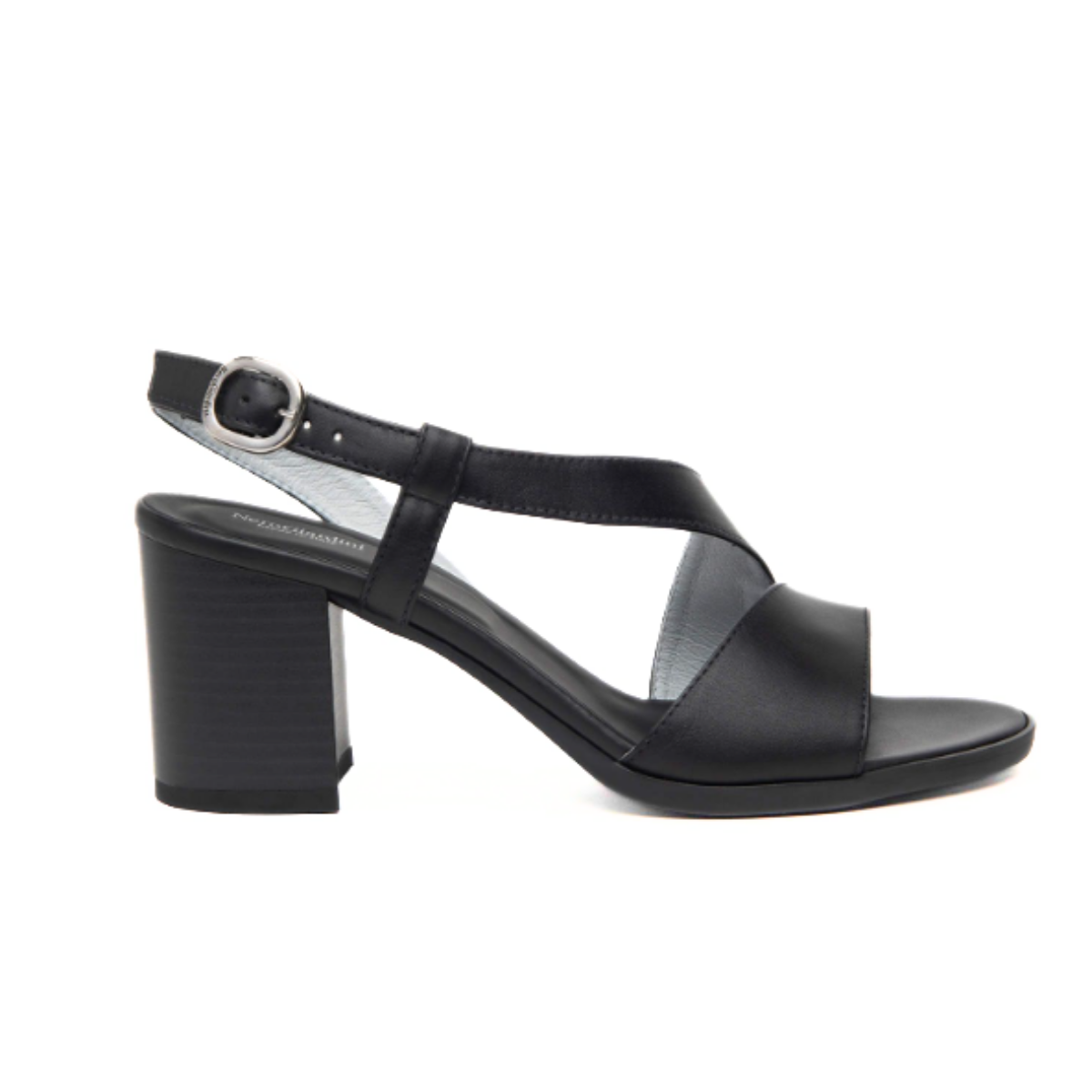 Sandalo elegante in pelle nera di NERO GIARDINI. Fascetta in pelle e incrocio con cinturino regolabile. Internamente morbido soffietto nel sottopiede rifinito in pelle. Suola in gomma antiscivolo, tacco largo rivestito 7 cm, leggero platform interno 0.5 cm. Calzatura con vestibilità comoda; ideata, disegnata e realizzata in Italia, prodotto made in Italy.