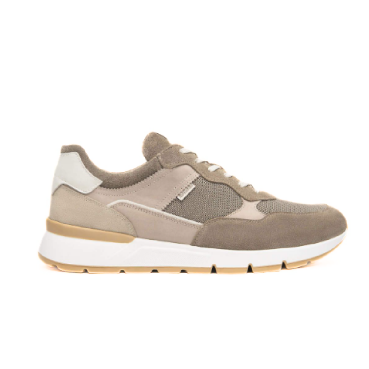 Sneaker da uomo di NERO GIARDINI. realizzata in camoscio beige con inserti in mesh e pelle. Interno e sottopiede, estraibile, foderati in pelle. Chiusura con laccio. Suola in gomma.
