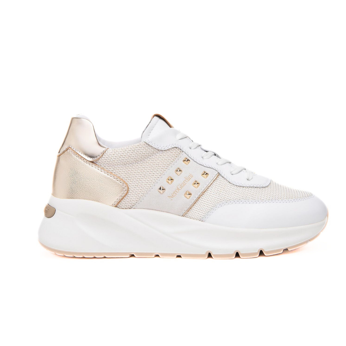 Sneakers da donna di Nero Giardini, tomaia realizzata in pelle bianca e oro, inserti in tessuto e borchie decorative. Chiusura con lacci. Interno e sottopiede estraibile in pelle e tessuto. Suola con zeppa in gomma.