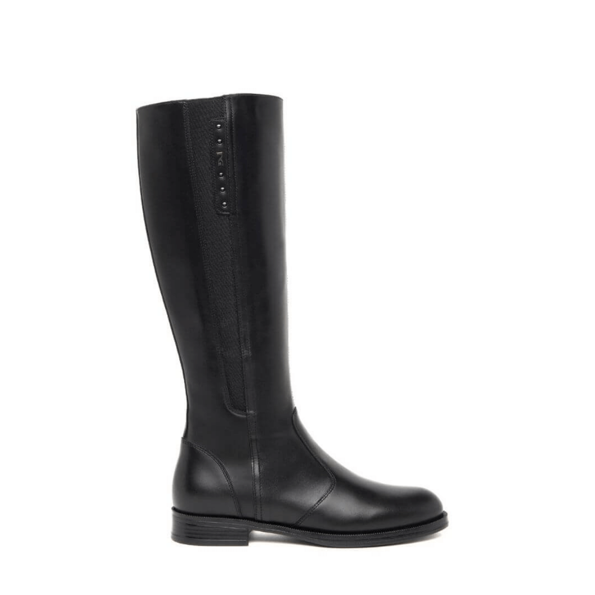 Stivale da donna di NERO GIARDINI in pelle nera, con elastico e logo unilaterale. Interno foderato in pelle con morbido sottopiede non estraibile. Chiusura con zip laterale. Suola in gomma.