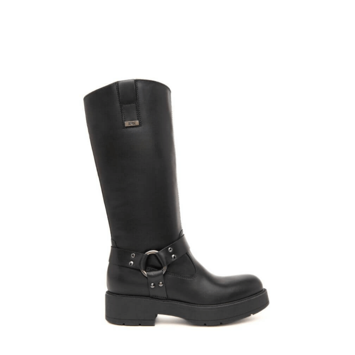 Stivale biker di NERO GIARDINI in pelle nera, con fibbie sulla parte bassa dello stivale. Interno foderato in pelle con morbido sottopiede non estraibile. Chiusura con zip laterale. Suola in gomma.