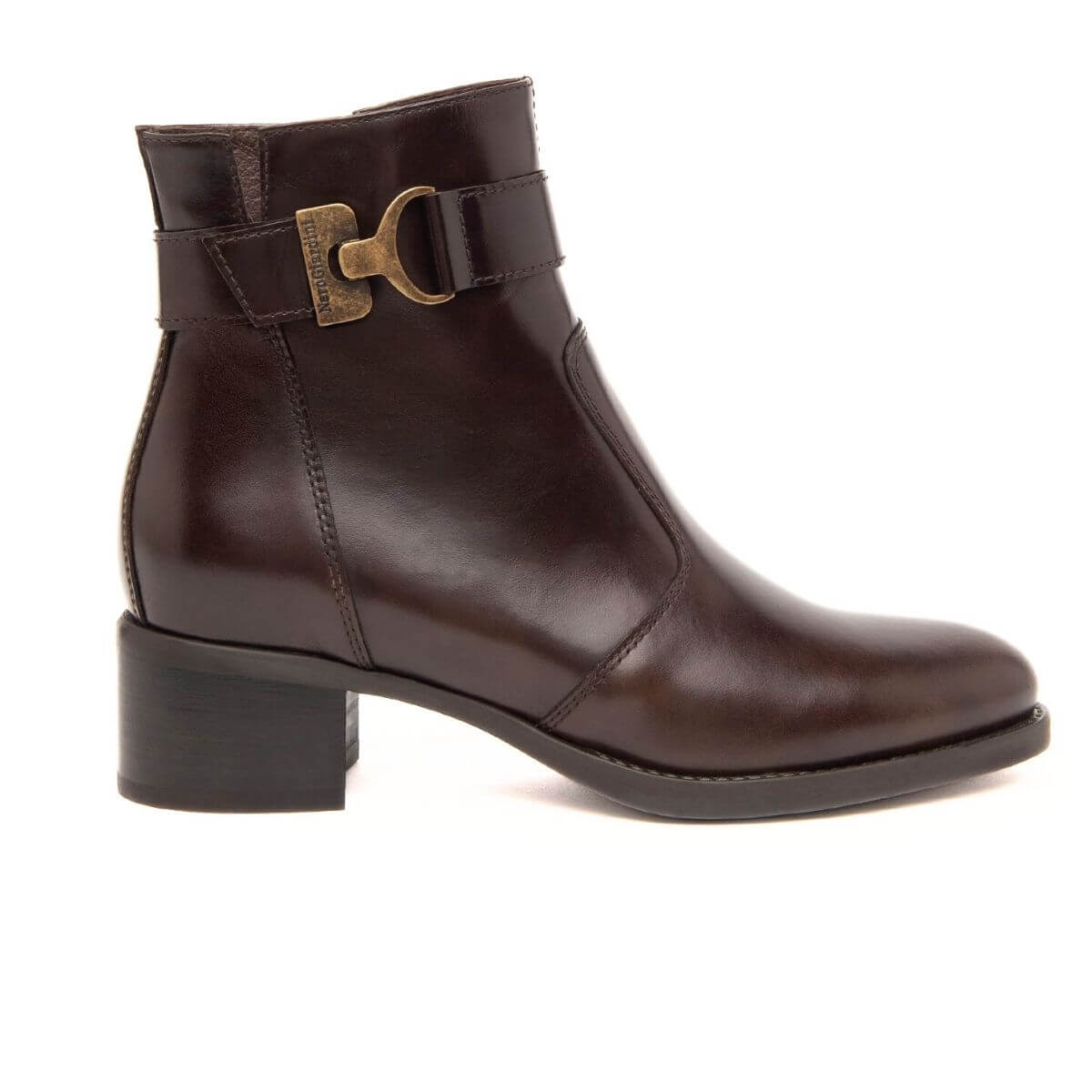 Stivaletto di Nero Giardini, personalità e stile unico. Realizzato in pelle color testa di moro con fibbia unilaterale e chiusura con zip. Interno e sottopiede, non estraibile, in pelle. Suola in gomma.