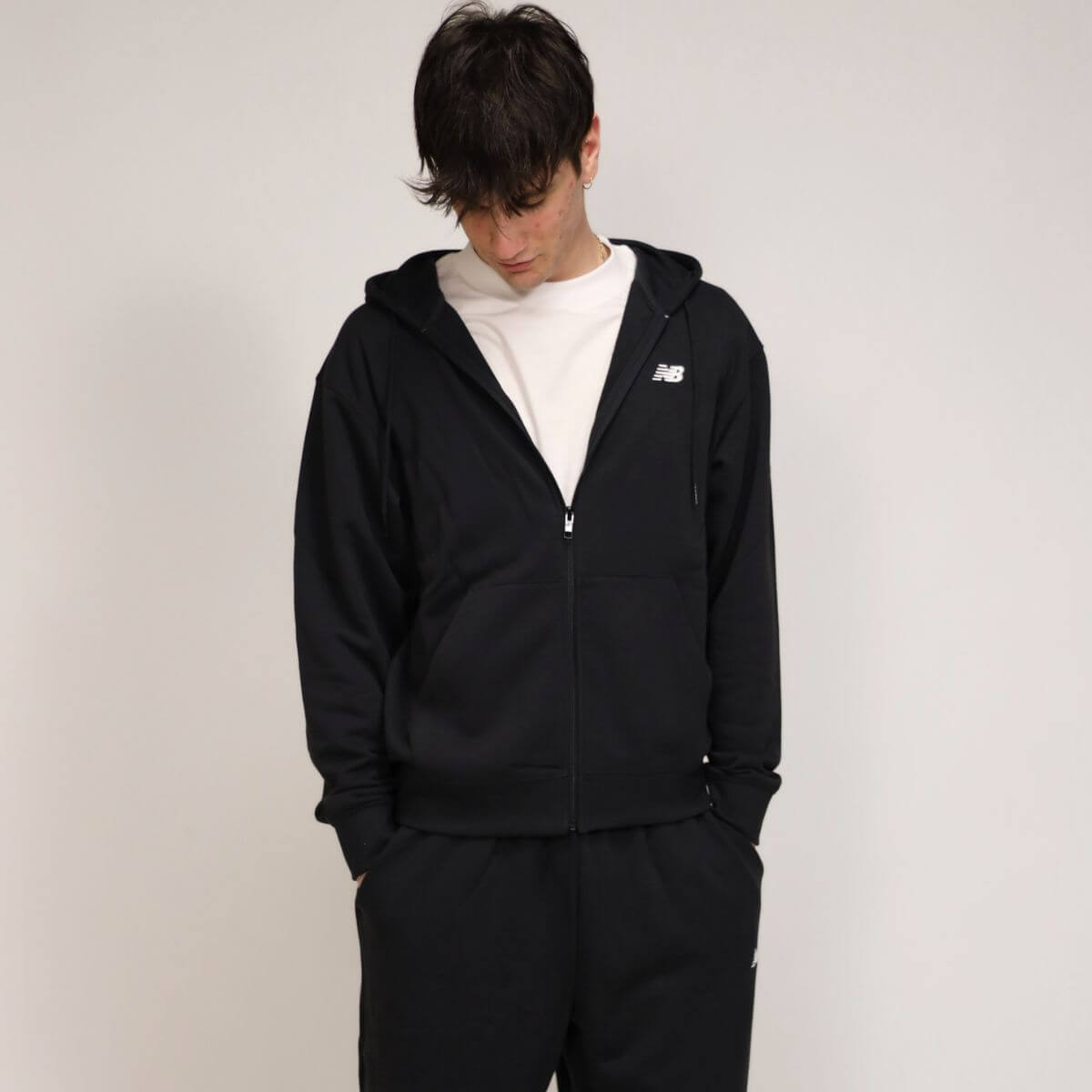 Felpa da uomo di NEW BALANCE, realizzata in tessuto nero con cappuccio. Chiusura con zip. Logo sulla parte frontale.