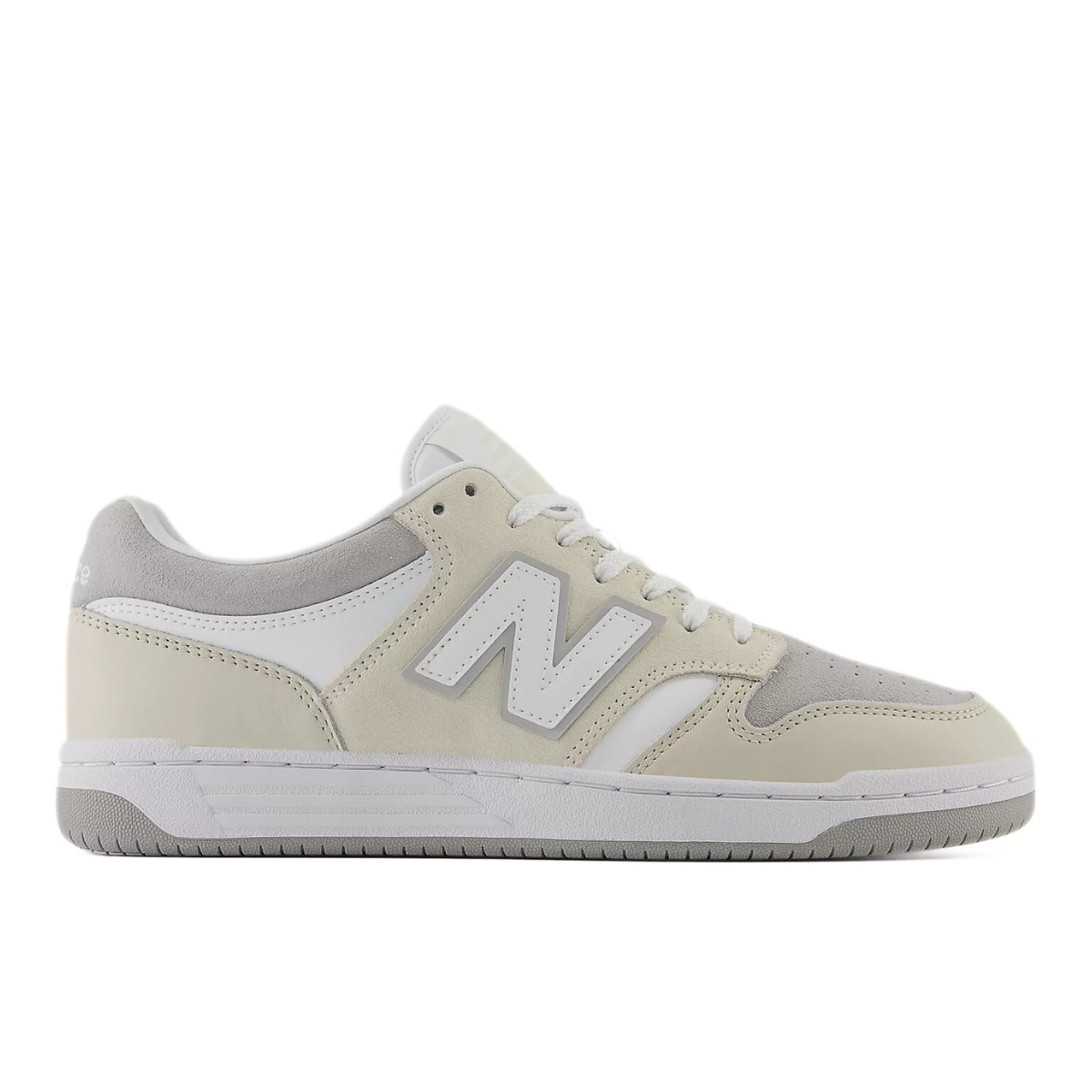 Sneakers, unisex, di NEW BALANCE modello basket 480 color beige, grigio e bianco. Tomaia realizzata in pelle e ecopelle. Sottopiede estraibile, suola in gomma resistente e allacciatura regolabile.